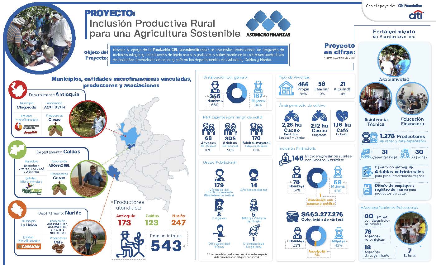 El apoyo de la Fundación Citi ha sido fundamental en el reconocimiento del microempresario rural como pilar clave del desarrollo económico y social del país, permitiendo que Asomicrofinanzas por medio de sus entidades asociadas contribuyan al fortalecimiento de los pequeños productores del sector rural, con el fin de aportar al mejoramiento de las condiciones agropecuarias que les permita impulsar sus negocios productivos y mejorar la calidad de vida de sus familias.