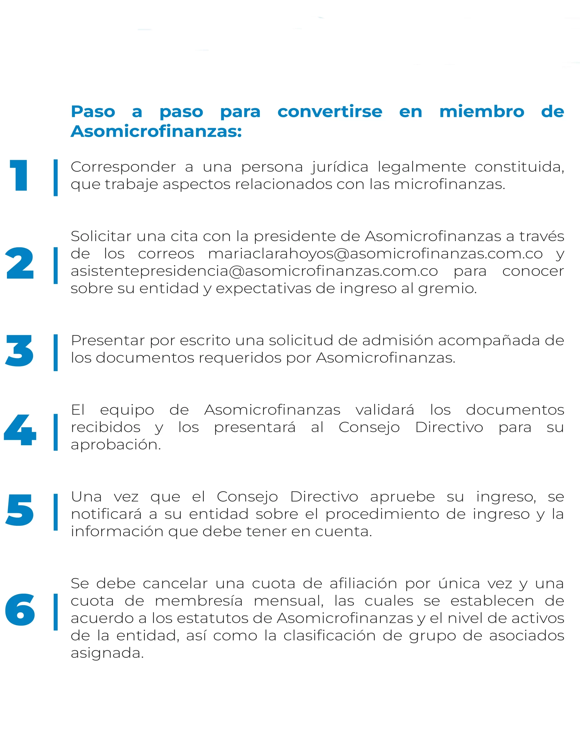 Las Entidades, que aspiren a ser miembros activos permanentes de LA ASOCIACIÓN y distintos de los miembros fundadores deben corresponder a una persona jurídica legalmente constituida, que trabaje aspectos relacionados con las microfinanzas y presentar por escrito solicitud de admisión, acompañada de los siguientes documentos: